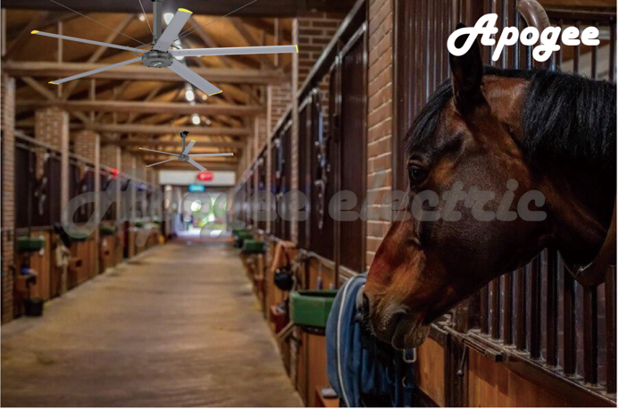 In conclusion, the importance of horse barn ceiling fans, particularly the Apogee ceiling fan, cannot be overstated. By improving air circulation, reducing heat and humidity, and promoting a healthy environment, these fans contribute significantly to the comfort and well-being of horses. Apogee ceiling fan has been using by Korea/Germany/Australia/England barn owners and managers, so no matter how far you are, just contact us , Apogee can provide the best ventilation and cooling solution with high quality ceiling fans .