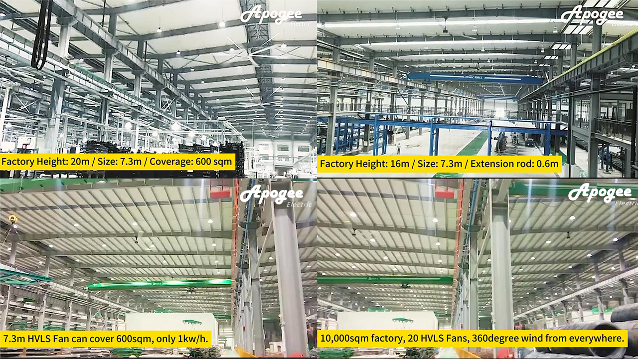 Apogee HVLS Fan is with PMSM direct drive motor, the height of the HVLS fan is much shorter than traditional gear drive type. The height of the fan is mostly length of the extension rod. In order to get a most effective coverage solution, and making sure there is enough safety space, we suggest to select a suitable extension rod, and need to consider the safety space between the blade tip and crane (0.4m~-0.5m). For example, if the space between I-beam to crane is 1.5m, we suggest to select extension rod 1m, if in another case the space between I-beam to crane is 3m, we suggest to select extension rod 2.25~2.5m. So the blades can be closer to floor and get bigger coverage.