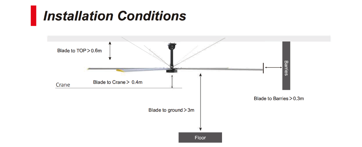 There is a minimum space requirement 3-5 feet as a safety to install HVLS Fan above the crane. Generally speaking the more space the better. You must precisely measure the space, and it’s the most critical step. Building Eave Height: The height from the floor to the bottom of the roof.